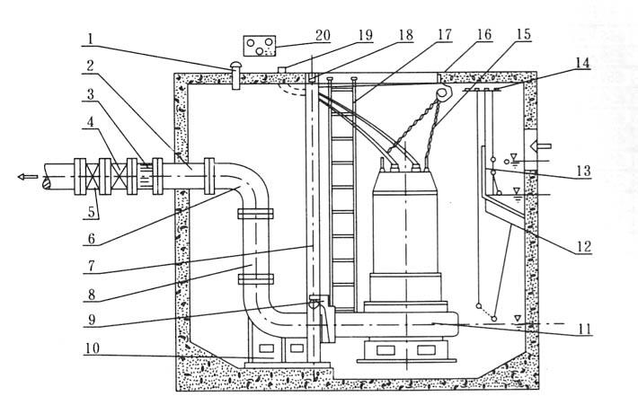 1.通風節 2.預(yù)埋管 3.膨脹節 4.逆止(zhi)閥 5.閘閥 6.彎管 7.導軌(gui) 8.出水管 9.支架 10.耦合(hé)底座 11.自動攪勻排(pai)污泵