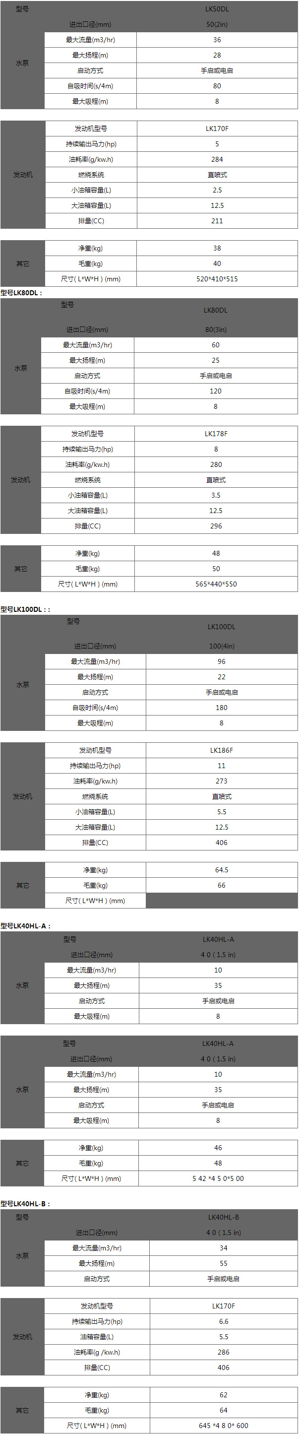 單缸(gāng)風冷柴油自吸水(shuǐ)泵技術參數: 型号(hào)LK50DL: